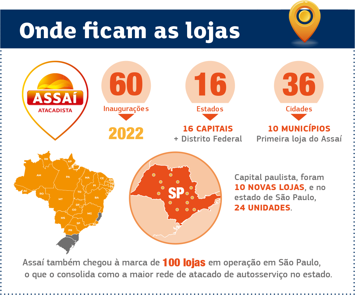 Foram 52 inaugurações só no segundo semestre, o que representa uma loja aberta a cada quatro dias. Assim, o Assaí encerrou o ano com 263 lojas em operação e uma área de vendas superior a 1,3 milhão de m², um incremento de mais de 340 mil m², cerca de 36%, em relação a 2021.