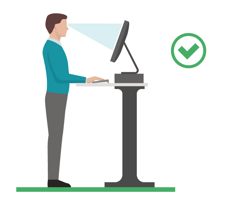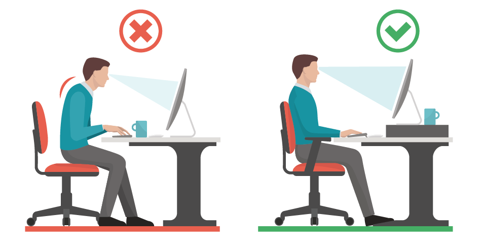 - Diante do computador, a tela deve ficar na altura dos olhos, evitando pressão nos ombros e no pescoço