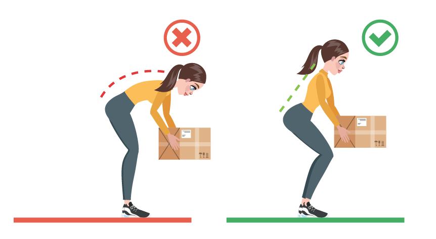 - Para elevar um peso do chão, abaixe-se, flexione os joelhos e utilize a força das pernas e dos braços na ação; evite descarregar todo o peso na coluna
