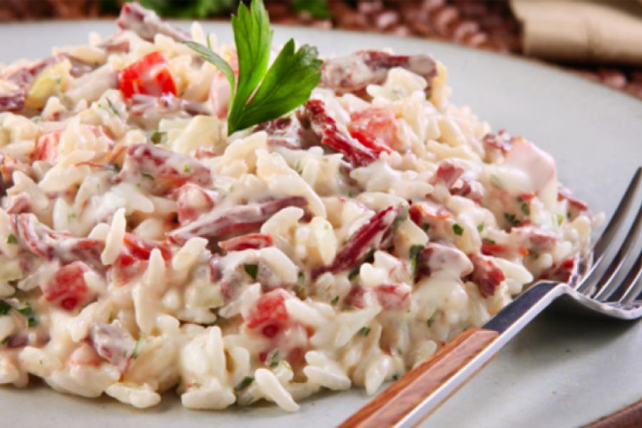 Refogue a cebola no azeite. Junte a carne-seca, refogue por mais alguns minutos e acrescente o tomate. Adicione o arroz e a água e misture. Inclua a maionese e mexa até que fique homogêneo e cremoso. Retire do fogo, adicione a salsinha, o queijo ralado e sirva em seguida.