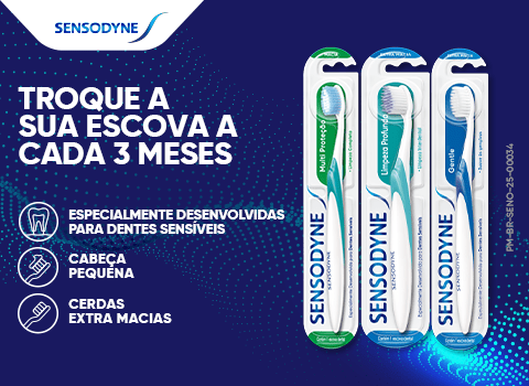 Para um cuidado bucal completo, é essencial trocar a escova de dentes a cada 3 meses³. As escovas Sensodyne foram desenvolvidas especialmente para quem sofre com dentes sensíveis, oferecendo uma limpeza eficaz e delicada. Com cerdas macias e design ergonômico, ajudam a remover a placa sem agredir o esmalte e as gengivas. Escolha Sensodyne e tenha o equilíbrio ideal entre proteção e conforto na sua rotina.