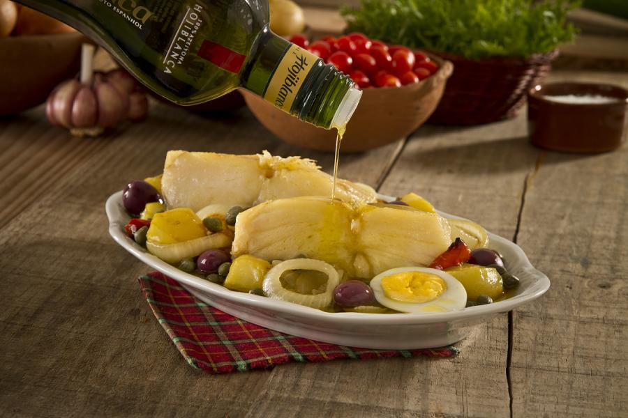 Coloque o leite, os cravos-da-índia, o louro e a cebola inteira em uma panela e deixe ferver. Em seguida, adicione o bacalhau dessalgado e deixe cozinhar por quatro minutos. Depois de cozido, reserve o bacalhau (retirar as espinhas). Em uma frigideira, coloque o azeite Hojiblanca e deixe esquentar em fogo brando. Acrescente o bacalhau e todos os outros ingredientes e deixe-o pegar gosto por dez minutos em fogo brando. Mexa cuidadosamente para não desmanchar o bacalhau.