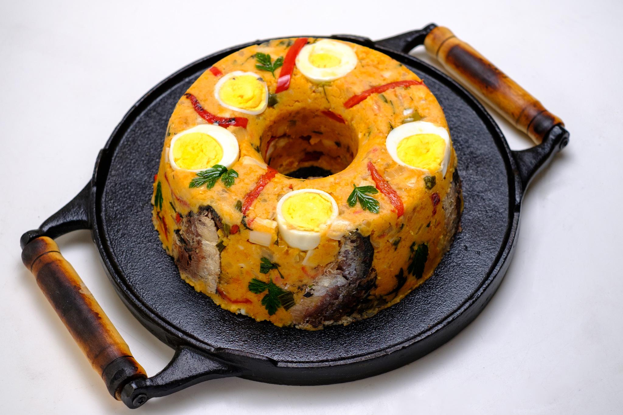 O preparo exige mais etapas, pois leva flocão de milho mais grosso preparado com tomate, cebola, ovos cozidos, camarão, sardinha e palmito. Tudo acomodado numa fôrma de furo no meio, que dá estrutura e caracteriza o prato quando desenformado.