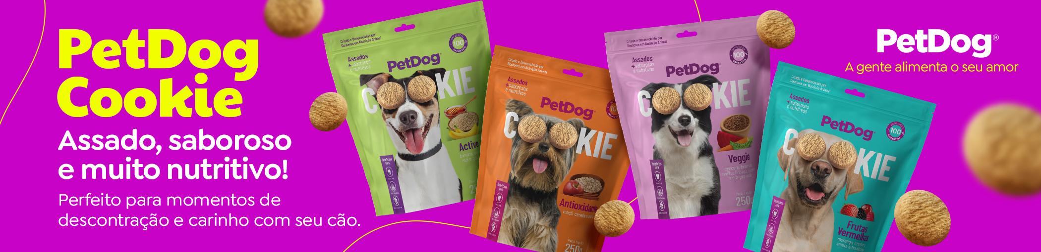 A linha PetDogCookie é feita de cookies assados, crocantes e saborosos que são livres de transgênicos e usam ingredientes selecionados que ajudam no cuidado da pelagem e da saúde oral e intestinal dos cães.