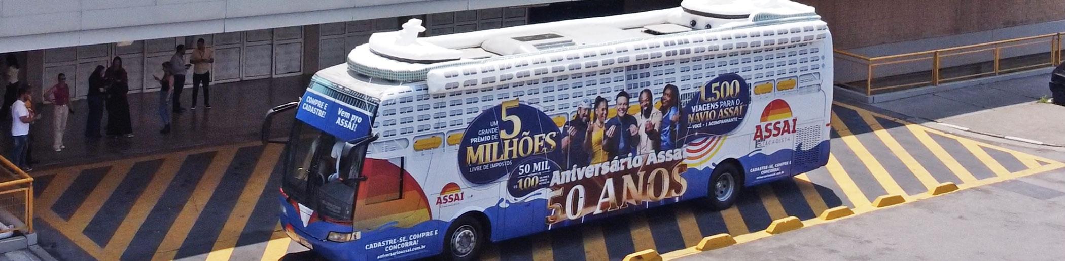 O ônibus, com aplique inflável no teto e adesivado como um navio, foi customizado para divulgar a campanha que contemplou 1.500 clientes Assaí com um cruzeiro exclusivo. A viagem está programada para fevereiro deste ano, entre Santos (SP) e Ilha Grande (RJ).