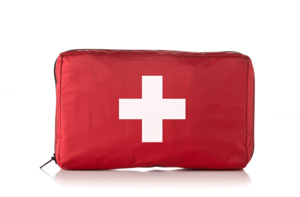 Pinça, tesoura, luvas cirúrgicas, máscara facial, óculos de proteção, bolsas térmicas (quentes/frias), gaze, esparadrapo, curativo adesivo, atadura de crepe, hastes flexíveis (cotonete), soro fisiológico ou solução iodada, antisséptico, saco plástico vedante.