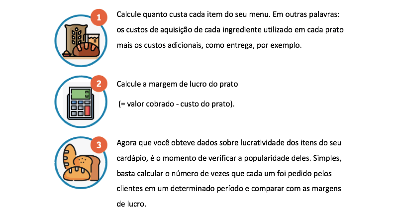 Para aplicar a Engenharia de Cardápio no menu do seu estabelecimento, não basta considerar apenas os itens mais caros que você oferece ou somente aqueles que têm mais saída. Para utilizá-la corretamente, você precisa fazer alguns cálculos e analisar certas informações a respeito do seu negócio. Veja abaixo um passo a passo: