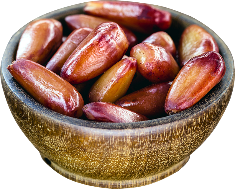A semente da Araucária, pinheiro nativo do Sul do Brasil, é um marco no inverno, fartamente servida em porções cozidas. Também pode ser assada na brasa da fogueira, picada e misturada em farofa. Descascá-la já se tornou uma habilidade sulista.
