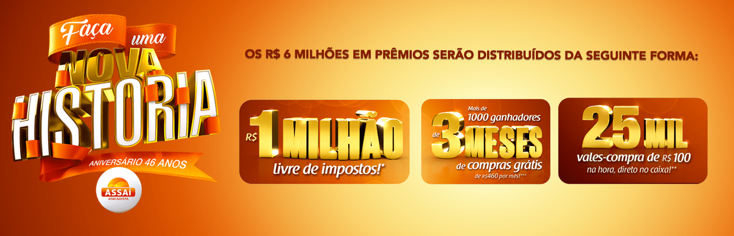 E, na comemoração dos seus 46 anos, a rede atacadista dá mais um grande passo para ajudar milhares de brasileiros a retomarem seus planos e escreverem uma nova história após vários meses de desafios. Durante o período da campanha de aniversário (entre 16/09 e 31/10/2020) serão distribuídos R$ 6 milhões em prêmios, a maior quantia em toda a história do Assaí! Para participar, é preciso se cadastrar – pelo site da campanha, pelo aplicativo do Assaí ou nos totens das lojas físicas. Antes de passar a compra, o cliente deve informar ao (à) operador(a) de caixa seu CPF ou CNPJ. Dessa forma, a compra será computada em seu cadastro automaticamente. Depois, a cada R$ 100 acumulados, o cliente ganhará um número da sorte para concorrer às premiações periódicas e ao prêmio final.