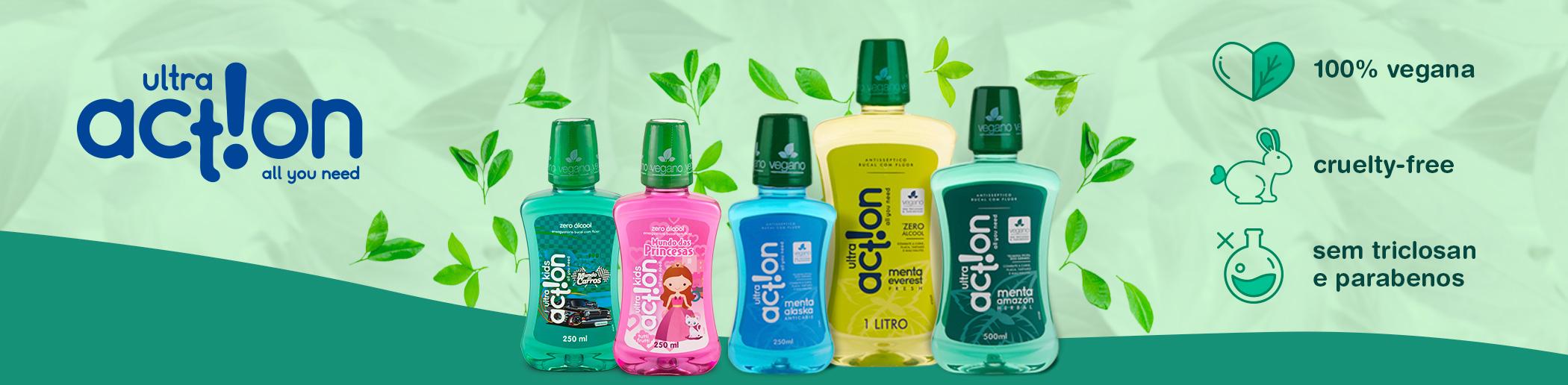A Ultra Action é a primeira marca de Higiene Bucal Vegana do Brasil. Livre de matérias primas tóxicas, você encontra no Assaí Atacadista produtos Ultra Action como enxaguantes bucais, cremes dentais, escovas de dente e uma linha infantil completa, pensada para os cuidados de uma vida saudável desde cedo.